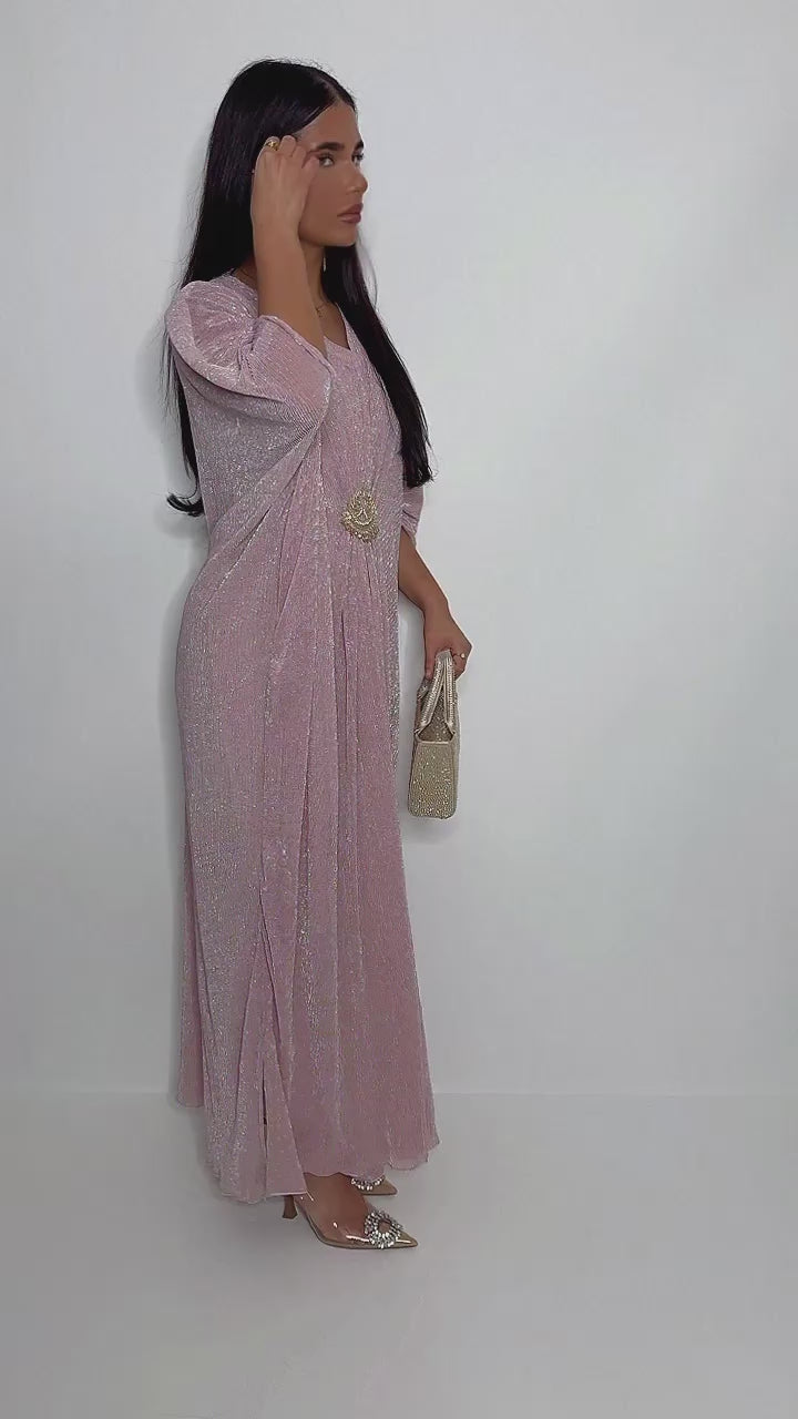 Slip into something effortlessly elegant. Elara is a blush pink shimmer kaftan that drapes beautifully and catches the light with every step. Designed with a soft V-neckline, statement brooch detail, and gentle pleating for a flattering flow. Comes as a complete 3-piece set including a coordinating inner slip and trousers, offering you both comfort and modesty.