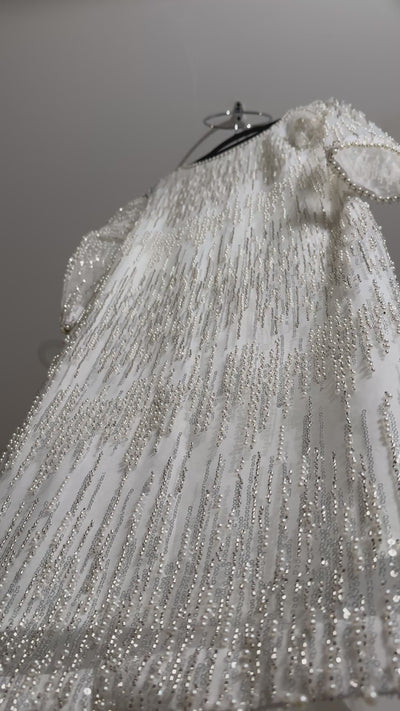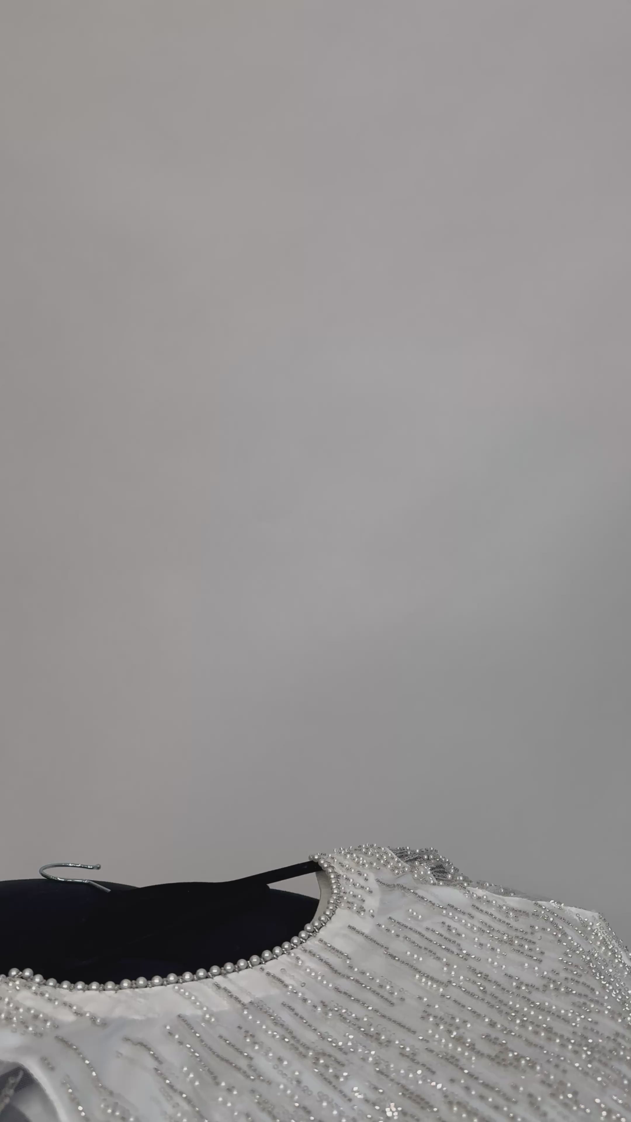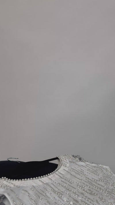 Meet Zareen — a white and silver three-piece Pakistani suit that brings cool-toned shimmer to life. The kameez is adorned with delicate sequins, beads & pearls that catch the light beautifully, while sheer sleeves add elegance. Sleeve lining is included should you require a modest finish.